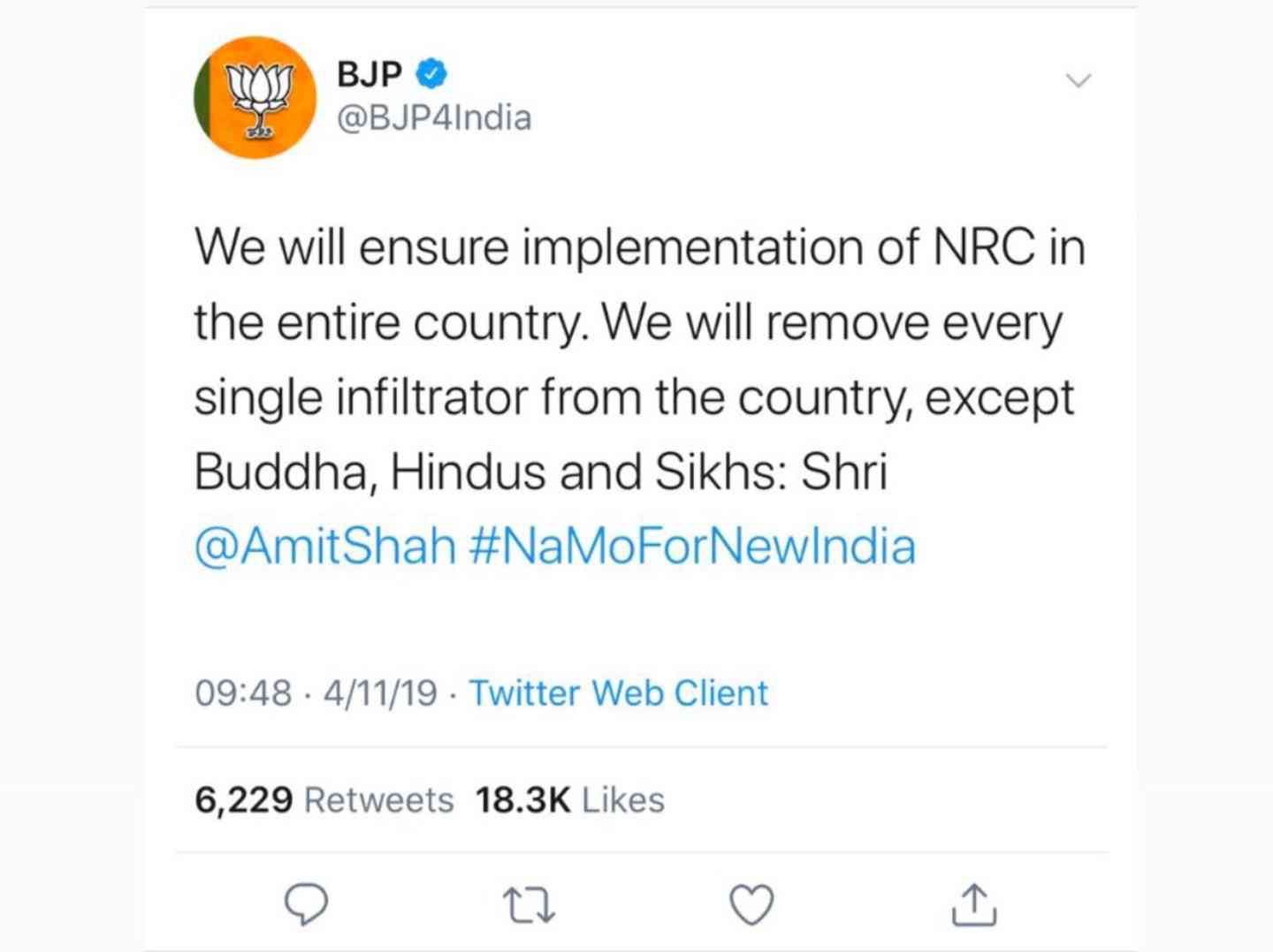 এর পর বিজেপির টুইটার হ্যান্ডলে অমিত শাহের সেই মন্তব্য ফলাও করে পোস্ট করা হয়। 'আমরা সারা দেশে এনআরসি রূপায়ণ করবই। হিন্দু, বৌদ্ধ এবং শিখ ছাড়া প্রত্যেক অনুপ্রবেশকারীকে আমরা তাড়াব'— অমিতের এই উক্তির পাশে #নমোফরনিউইন্ডিয়া লিখে অনলাইন প্রচার চালিয়েছিল বিজেপি।